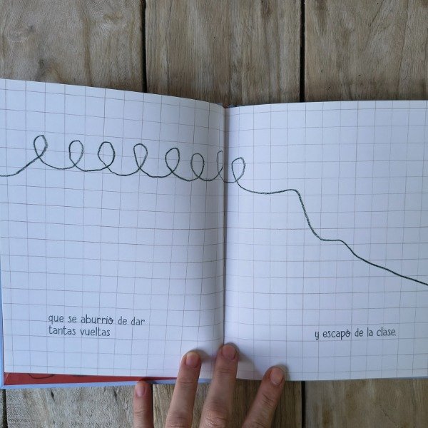 Este original libro está protagonizado por una línea. Es una sencilla raya hecha con lápiz que un día se aburre de hacer ejercicios sobre la página de un cuaderno cuadriculado y decide escapar del salón de clases. Muy contenta se va a recorrer el mundo. Así, la línea llega a una ciudad, escala altas montañas y conoce el mar, donde se enfrenta a unos temibles piratas. Es entonces cuando los lectores se percatan de que el verdadero protagonista de la historia es un niño llamado Leonardo, quien echa a volar su imaginación en medio de la clase y, mientras sus compañeros practican caligrafía, él se lanza a la aventura.